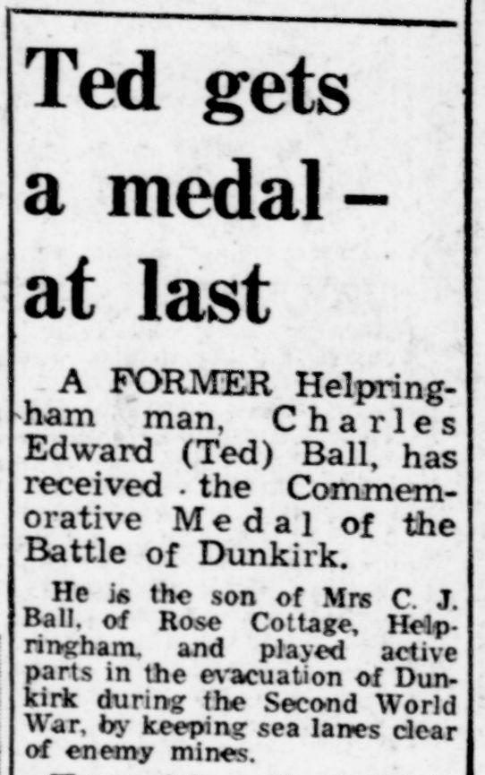 - “Ted Gets a Medal — at Last,” Sleaford Standard, 7 July 1972, p. 3, col. 3; digital image, Findmypast (findmypast.co.uk). Cited for award of the Commemorative Medal of the Battle of Dunkirk 1940.